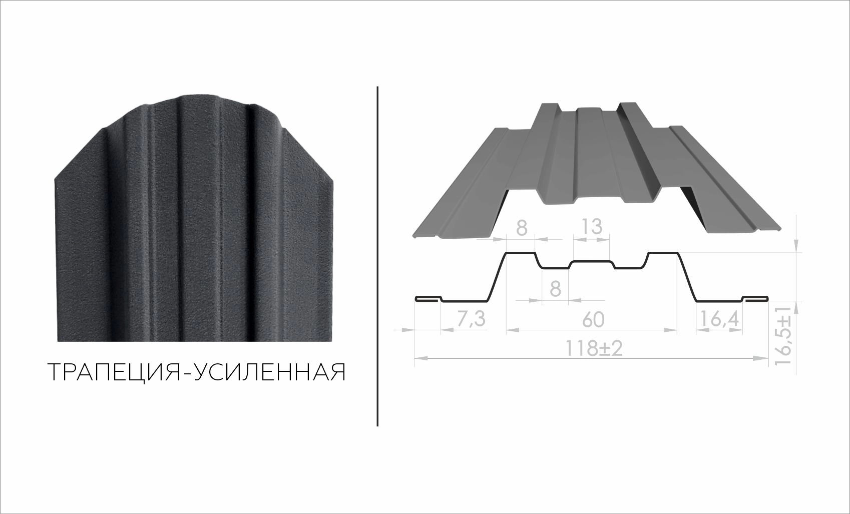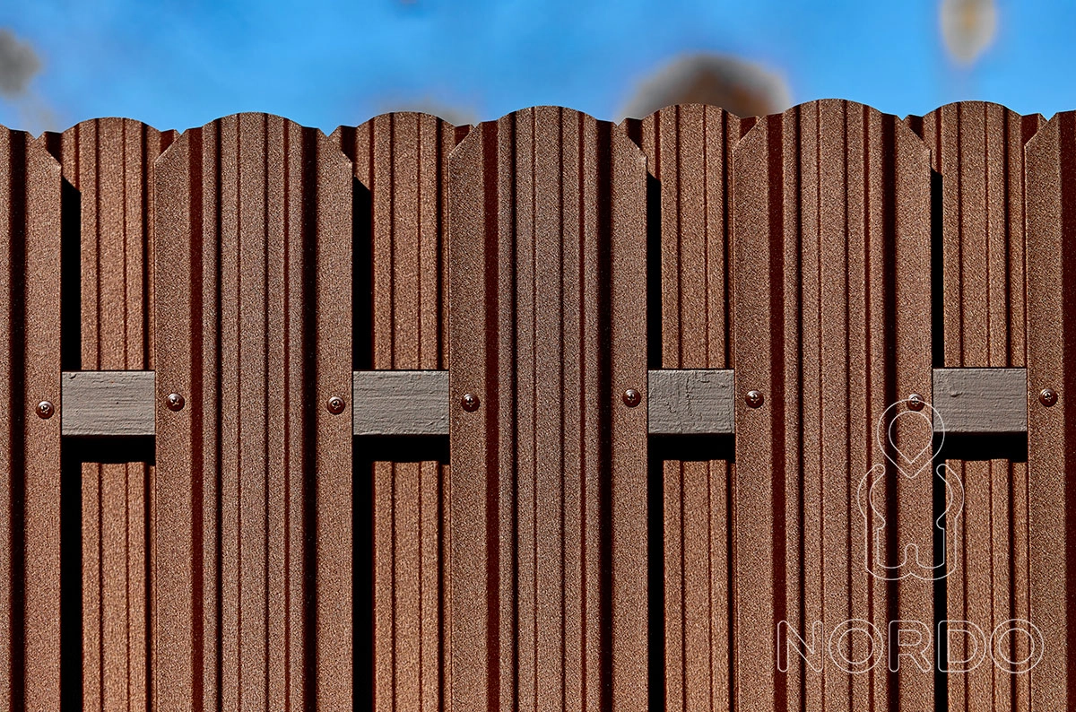 Планка шириной 118 мм обеспечивает прочность конструкции и придаёт забору выразительный внешний вид. Металл защищён современным полимерным покрытием, благодаря чему штакетник сохраняет долговечность и не требует сложного ухода.