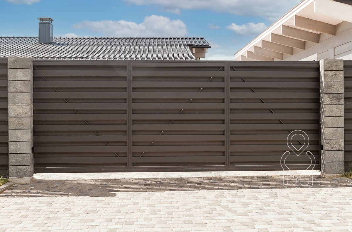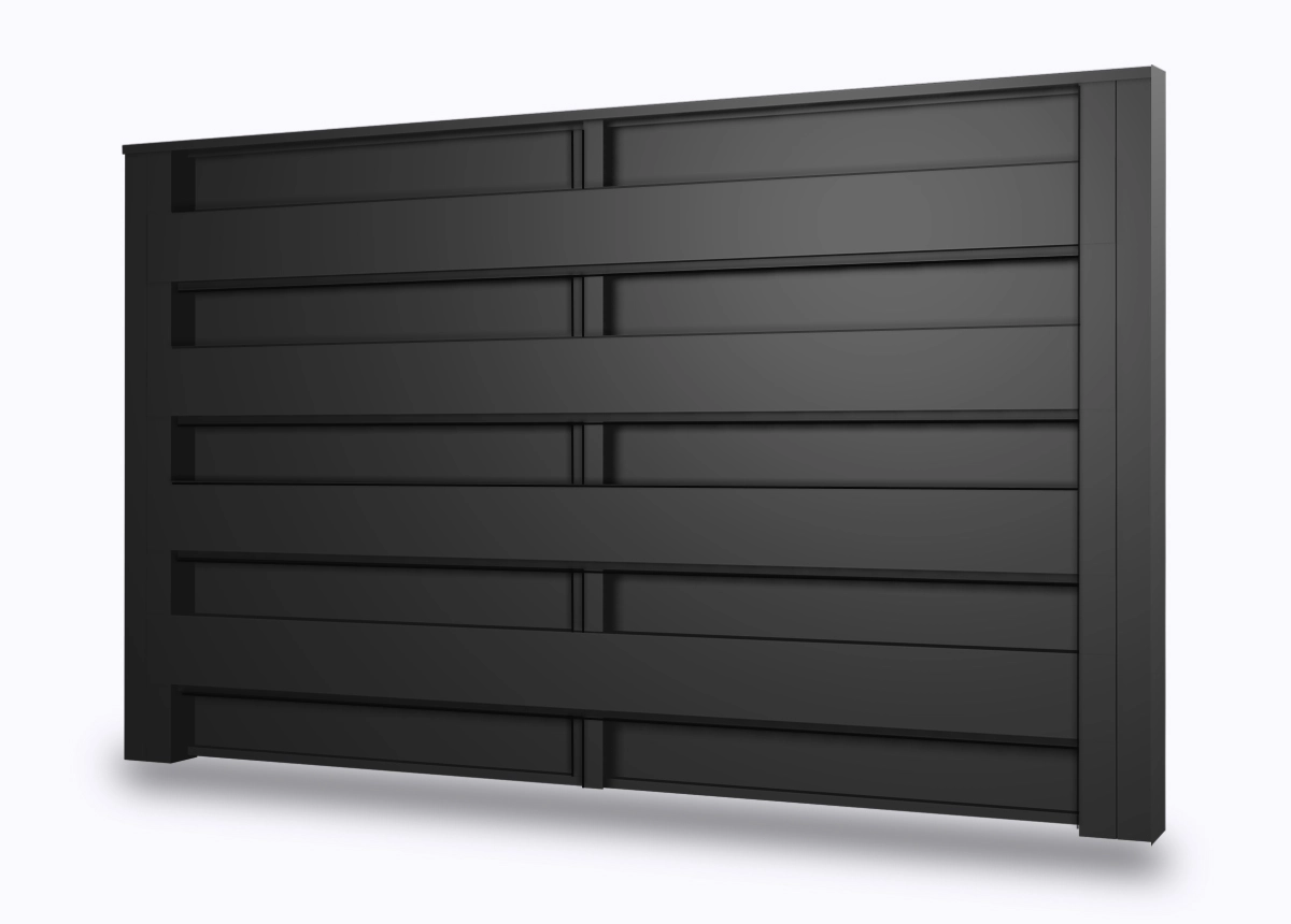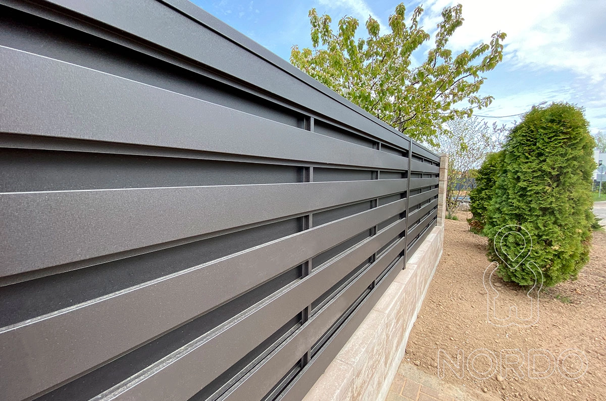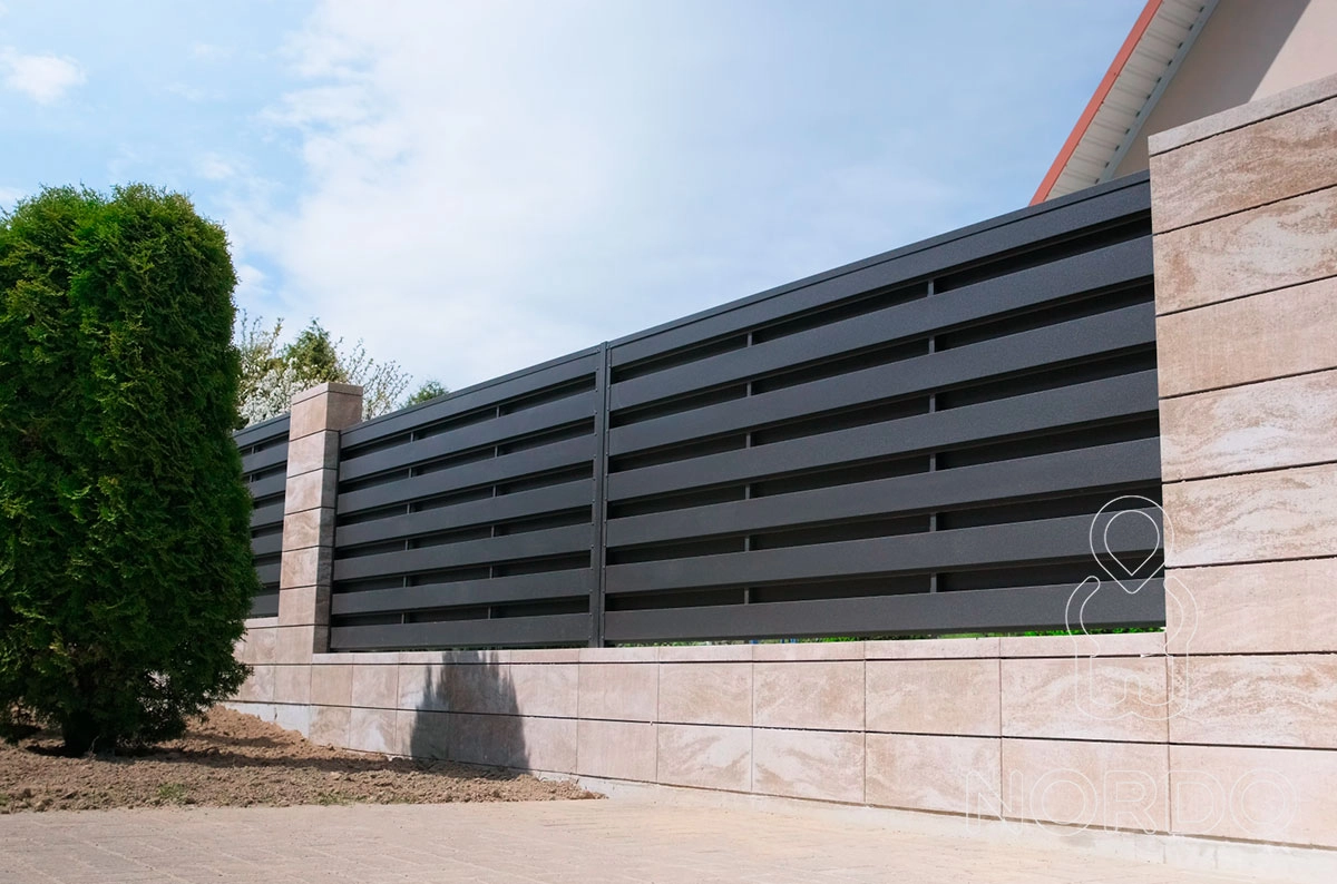 Горизонтальные металлические заборы Ранчо состоят из элементов, расположенных в шахматном порядке. Панели образуют сплошное полотно с выразительной геометрией, глубиной и объемом. При этом воздух свободно проходит через элементы, исключая парусный эффект.